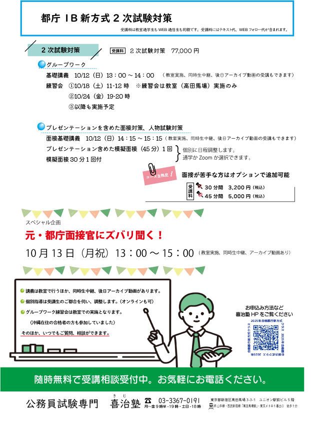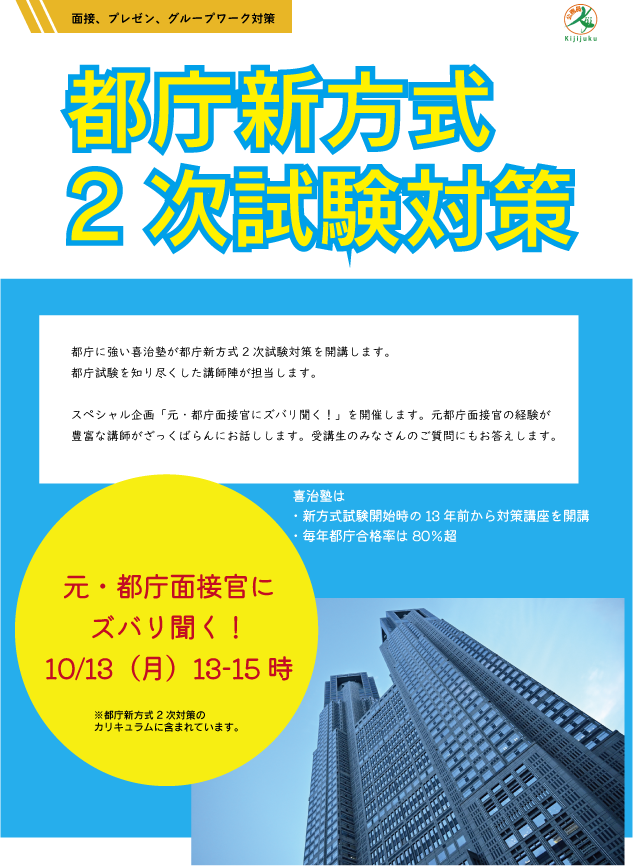 都庁ⅠB新方式(第2回)試験対策講座2次試験対策に申し込みの方参加可能です。