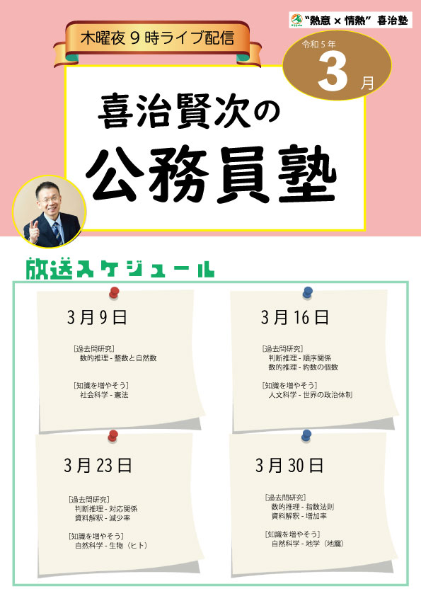 木曜夜9時「喜治賢次の公務員塾」3月は無料公開!!