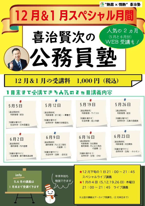 木曜夜9時「喜治賢次の公務員塾」3月は無料公開!!