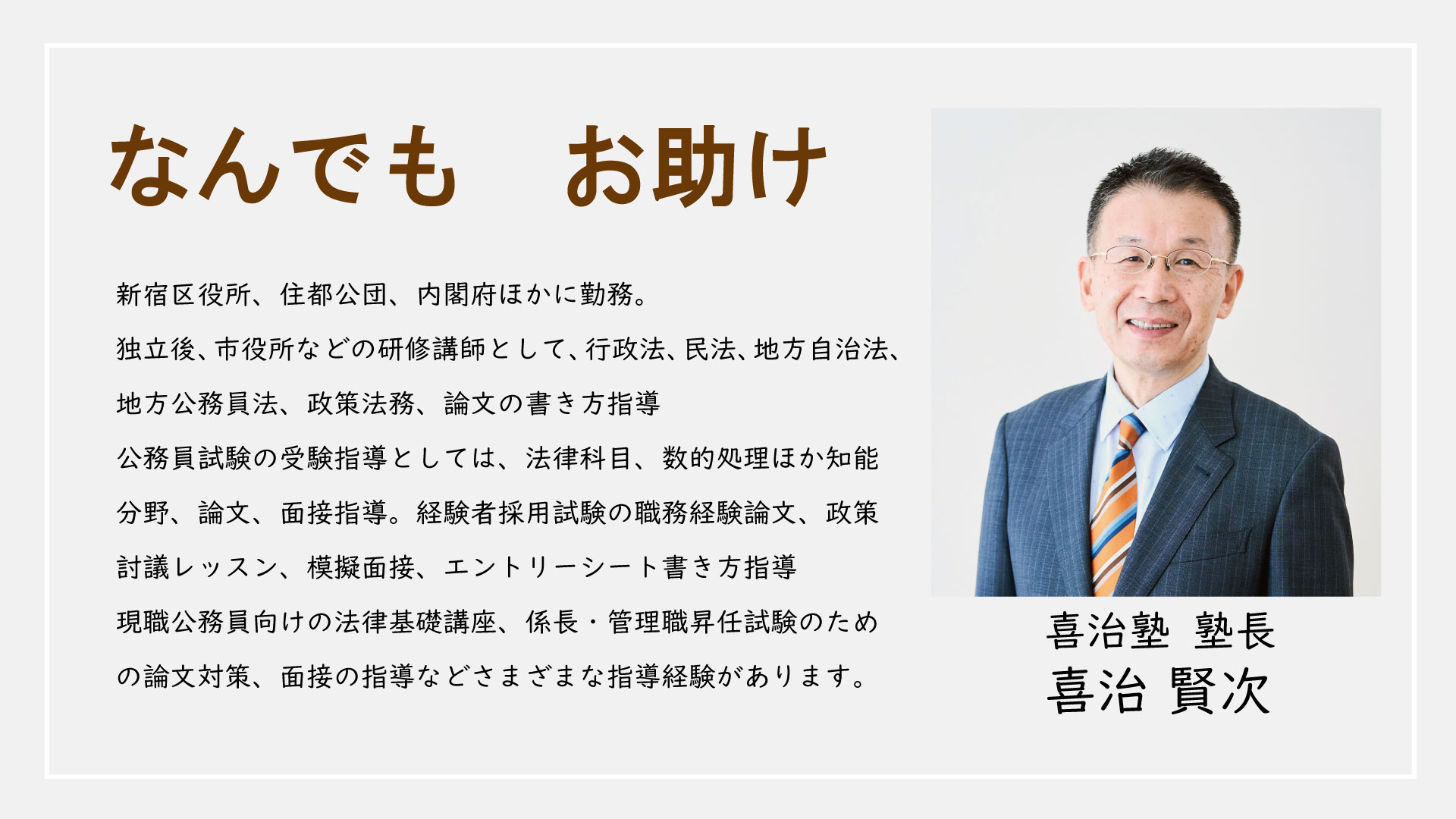 これまで25年間、「喜治塾」で、また「役所」で指導してきた経験を活かし、